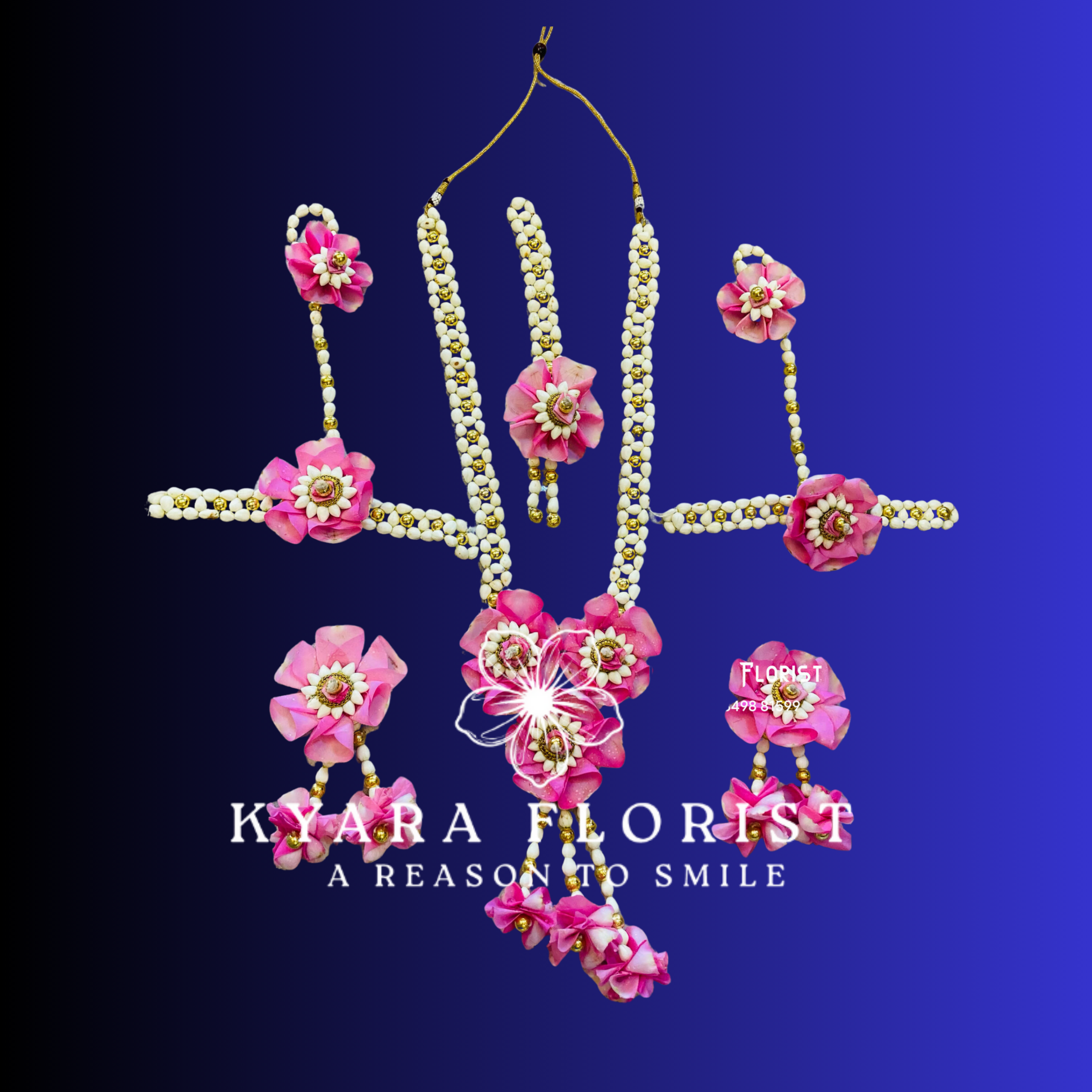 The Design: Features vibrant pink rose centers accented with golden beads and white pearl-style floral clusters.